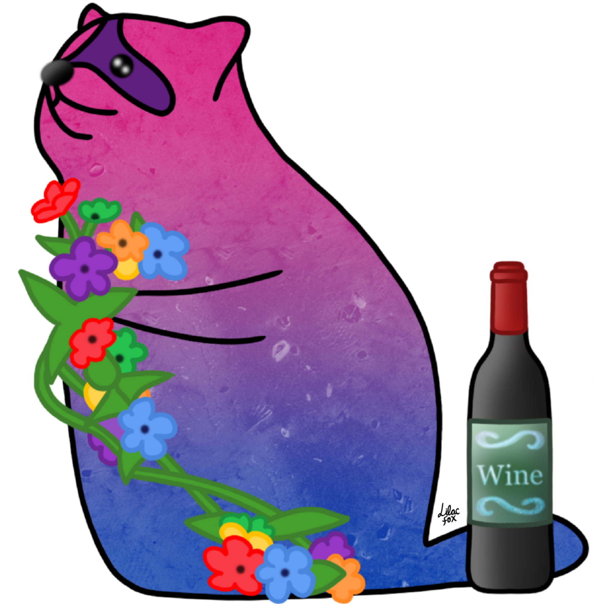 Celebrate in style with this adorable sticker featuring a raccoon in bisexual flag colors, clutching vibrant rainbow flowers with a bottle of wine by its side. A playful and proud addition to any collection!