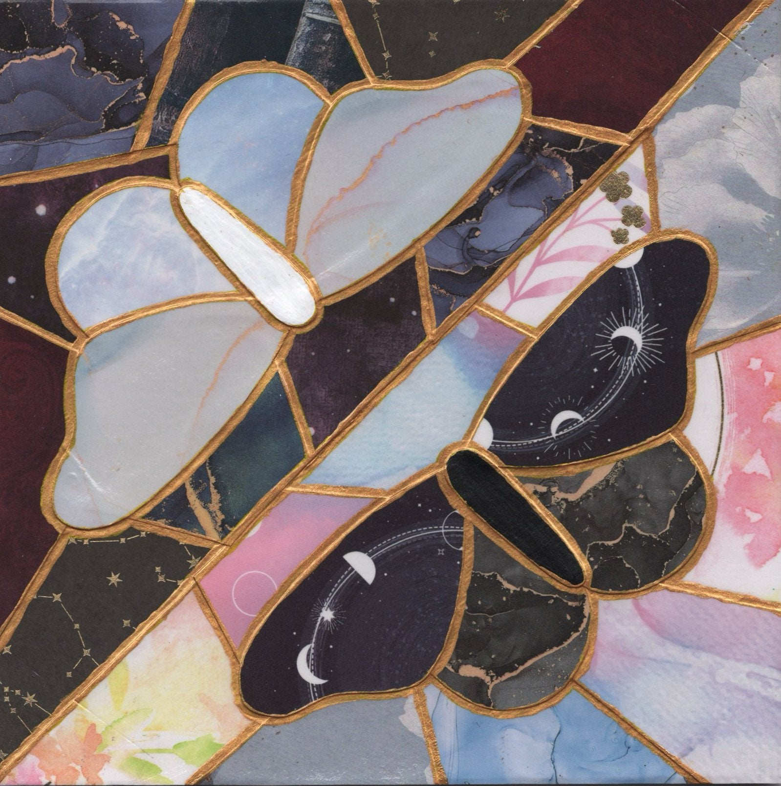 This captivating split canvas art print features a dark side and a light side, each with a contrasting butterfly crafted from intricate collage pieces. A powerful representation of balance, transformation, and the harmony between opposites.